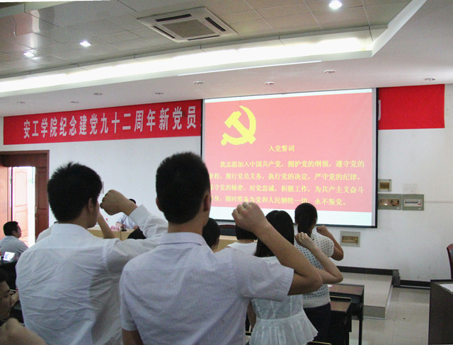 活动在雄壮的国歌声中拉开帷幕。在学院人事政工部老师的带领下,150多名新党员满怀激动得心情进行了入党宣誓,老党员重温入党誓词,庄严激昂的入党誓词在整个教室回荡。
