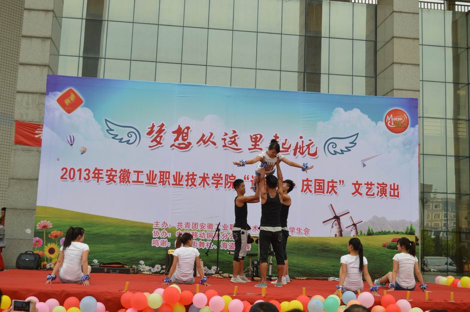 为热烈庆祝建国64周年,欢迎2013级新生的到来,展现学院深厚的校园文化积淀和浓郁的艺术氛围,9月27日下午,由学院团委、院学生会联合主办,中国移动铜陵分公司协办的“梦想从这里起航”2013年迎新生·庆国庆文艺演出在教学楼广场隆重举行。学院副院长丁忠兰、学生工作处、各系党支部书记、团总支书记等相关部门负责人亲临演出现场,与2013级新生欢聚一堂,共同观看了文艺演出。