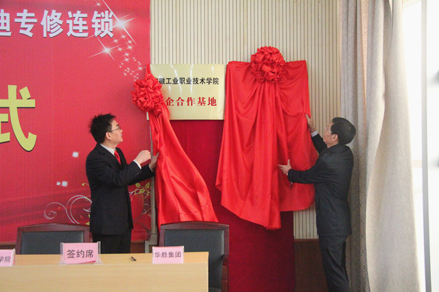 10月17日,学院与华胜集团举行校企合作签字揭牌仪式,开班培养汽车维修专业技术人才,进行订单式培养。学院院长陈世虎、常务副院长李庆峰、副院长马平、华胜集团总裁周大军、华胜集团南京区域总经理李长华、华胜集团南京区域行政经理金琴、华胜集团无锡新区店总经理兰培杰、华胜集团宜兴店总经理孙建、华胜集团常州店总经理吕东及学院各部门各系部主要负责人、有关教师和辅导员、部分汽车专业学生代表出席了仪式。