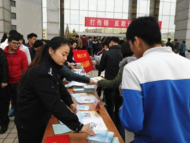 近日,我院联合工商局、打击传销领导小组、长江路派出所在学院教学楼,开展以播放教育片、展板宣传、发放防传销防毒品的宣传资料、以及学生签名的宣传教育活动。学院共有600多名学生参加了这次活动。