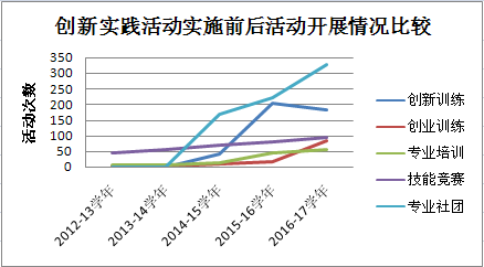 开展创新实践活动三年多来,共组织各类与专业有关的第二课堂活动1620项次,较改革实施前的两年平均每年增加481项次;参与各类活动的学生共52016人次,较改革实施前的两年平均每年增加13525人次。