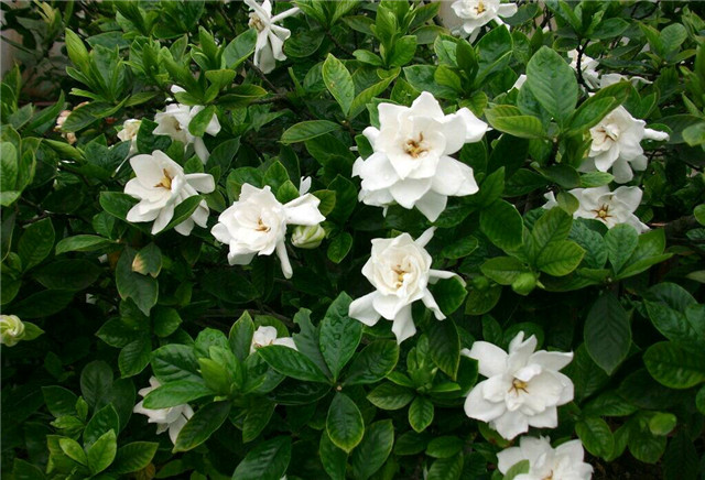 生活区中间绿化带开满白色花朵的小叶栀子花。