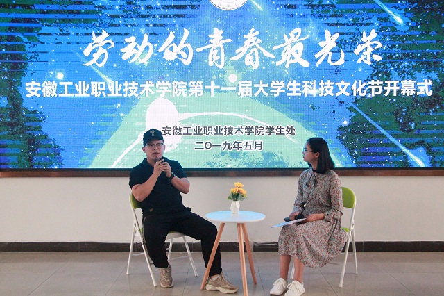 第十一届大学生科技文化节组委会主任李庆峰在开幕式上致辞,充分肯定大学生科技文化节作为校园文化内涵的外在表现形式和有效载体,为安工学子展示独特个性与魅力风姿提供了青春的舞台。随后,组委会副主任周理瑞向在场师生介绍了本届科技文化节实施方案。在随后的嘉宾访谈环节中,学生主持人与现场两位嘉宾进行了面对面访谈。两位嘉宾分别分享了他们的成长经历和工作经验,精彩解读了劳动价值与工匠精神的内涵。