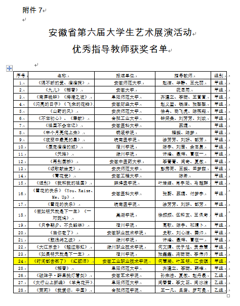 近日,省教育厅公布了全省第六届大学生艺术展演活动评选结果,我校荣获艺术作品二等奖一项,艺术表演三等奖一项,三名教师获得优秀指导教师奖。
