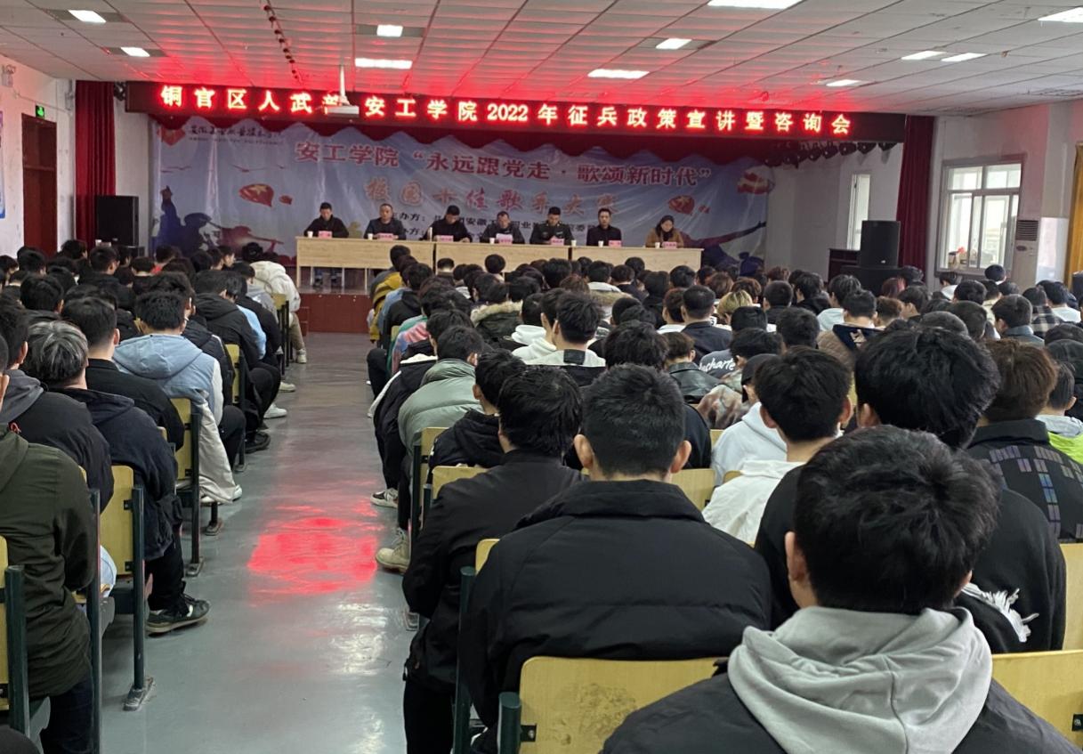 为切实做好2022年大学生征兵工作,服务广大青年学子了解征兵相关政策,鼓励优秀青年投身军营,挖掘更多优秀兵员,学院武装部联合铜陵市铜官区人武部,于2021年12月3日和12月10日,分两批次在学院图文信息楼会议室组织开展大学生征兵政策宣讲暨咨询活动,参加人员达1000余人。活动由学院武装部部长郭云峰主持,学院副院长曹芳胜、铜陵市铜官区人武部副部长葛松林等三人以及学院各系部领导出席了活动。