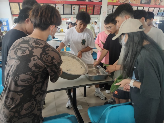 6月3日,端午节当天中午,学院团委组织同学们在第二食堂进行包粽子活动。同学们拿着粽叶,盆里盛满了糯米,一颗颗枣子、一片片粽叶,也盛满了大家的喜悦。折叠粽叶,填放食材,包裹成型,扎紧粽子……每一个步骤无不在学习,都考验着同学们的耐心。同学们一边认真地聆听着老师关于端午节来历及风俗习惯的讲解,一边动手做粽子。虽然大家做的不够熟练,形状也不太美观,但在老师的指导下和同学互相帮助下,一个个外形美观的粽子还是被包了出来。