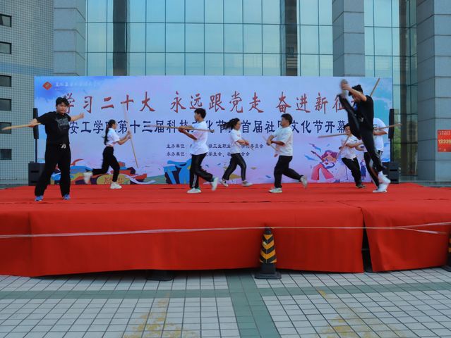 为充分发挥学院社团繁荣校园文化的作用,全面提升学生的综合素质,营造积极向上的艺术氛围,学院团委于4月21日下午在教学楼前广场举办了“学习二十大、永远跟党走、奋进新征程”第十三届科技文化节暨首届社团文化节文艺汇演,19个学生社团及学生会等团学组织参加了演出,现场气氛热烈。
