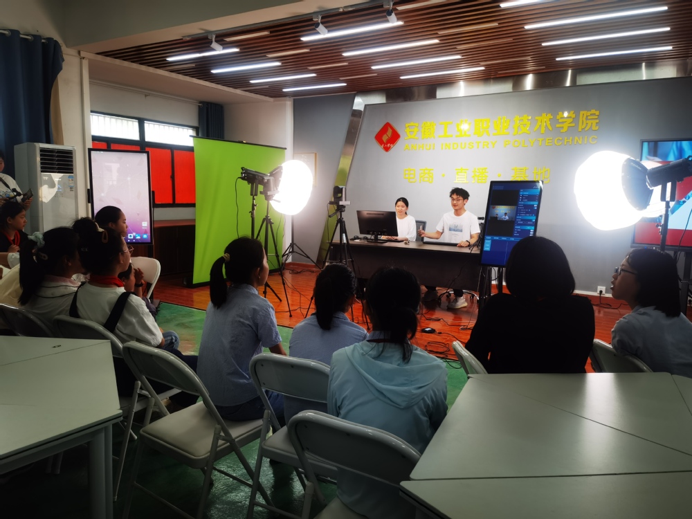在电商直播实训室中,吴老师首先介绍了电商直播这一新兴行业和直播销售员的岗位职责,学院电商专业学生进行了现场商品直播演示,在建安小学佘校长的鼓励下,学生们积极踊跃地走上主播台模拟直播卖货,开启了他们的直播首秀。