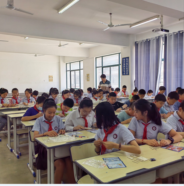 实践操作环节,老师给同学们发放了科学实验套件,同学们根据图纸将一块块零件拼装成了手摇发电机、电风扇、双螺旋桨飞机等模型。