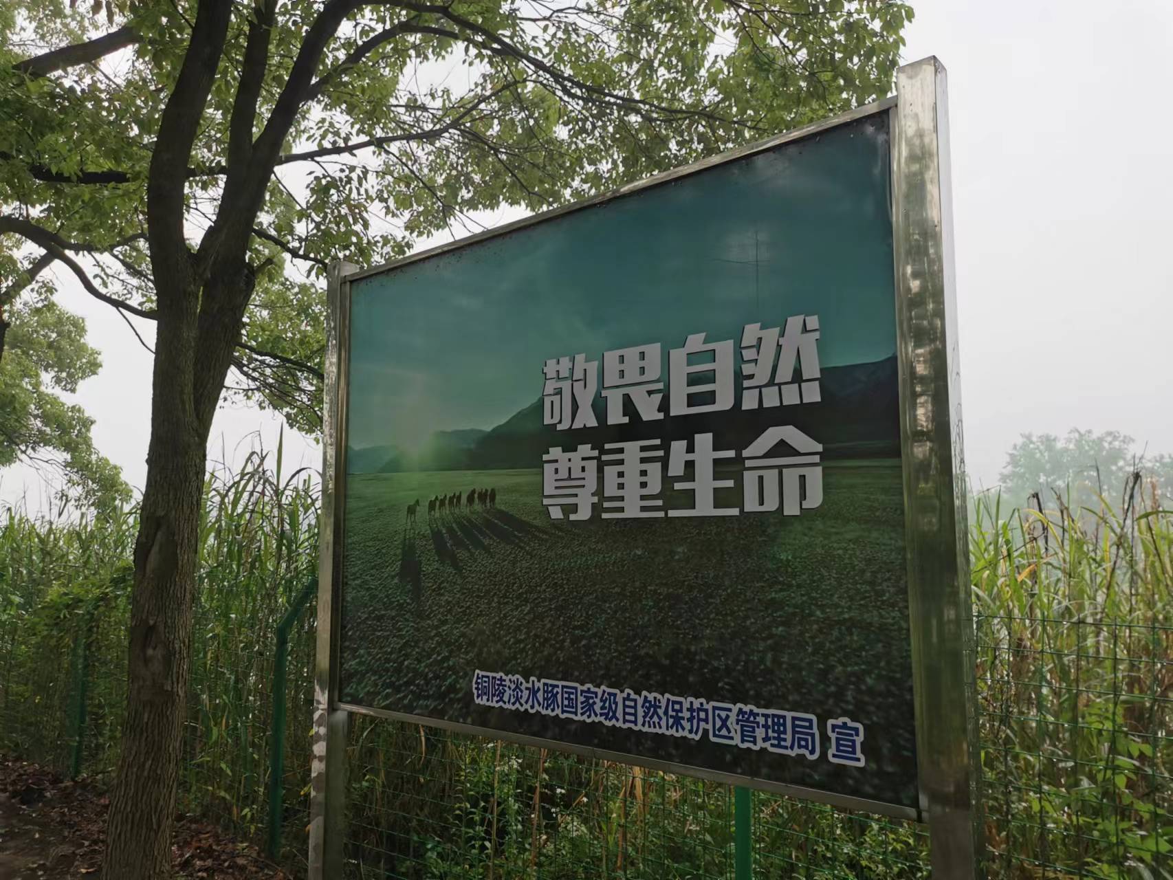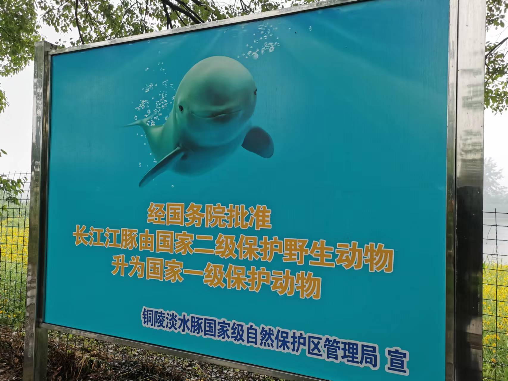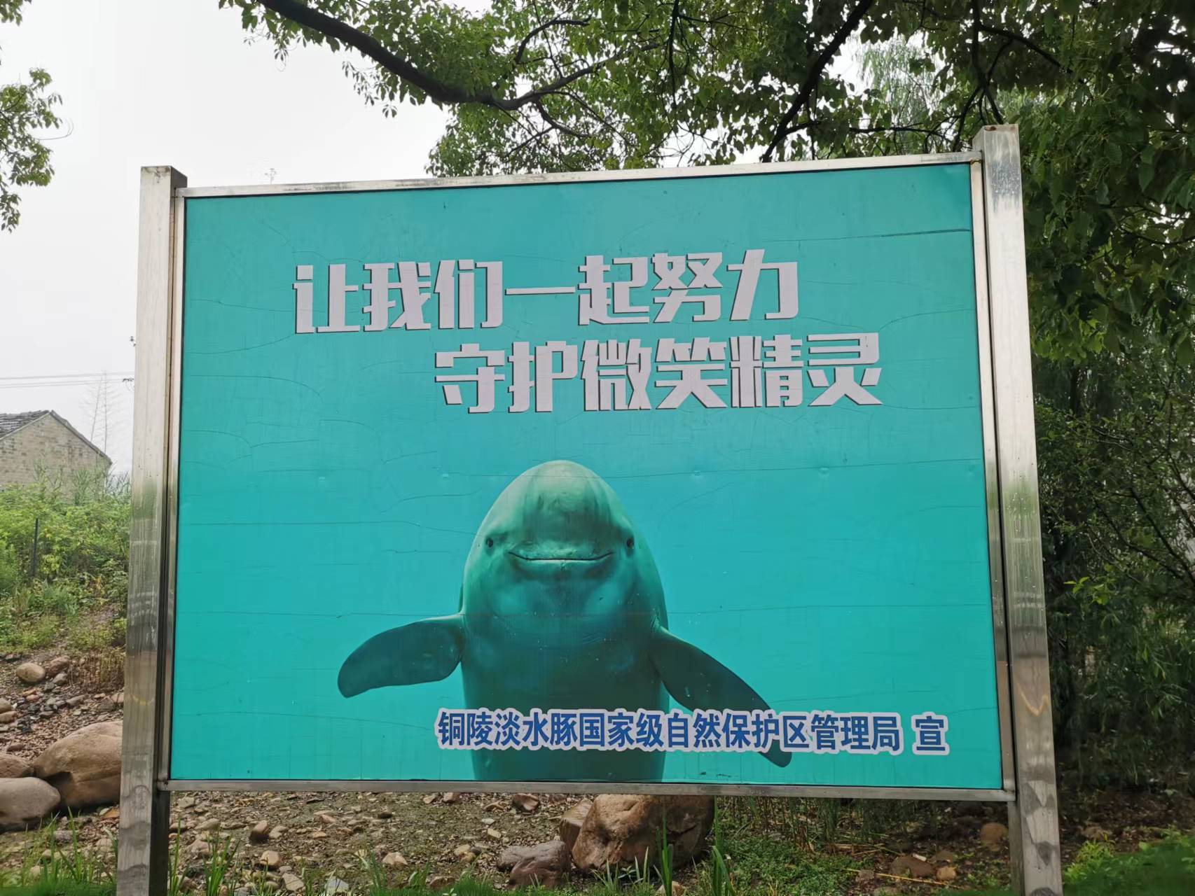 在前往保护中心的道路两边,树立了各种宣传标牌,旨在提高公众对江豚保护的重视程度。