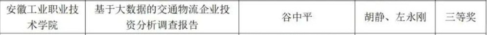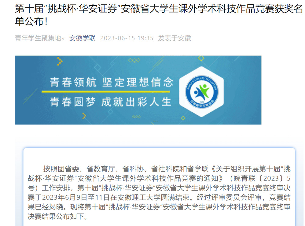 近日,在由共青团安徽省委员会、安徽省教育厅、安徽省科学技术协会、安徽省社会科学院、安徽省学生联合会等单位共同主办的第十届“挑战杯”安徽省大学生课外学术科技作品竞赛中,我院管理工程系胡静等老师指导的21级大数据与会计班学生谷中平的作品《基于大数据的交通物流企业投资分析调查报告》荣获省级三等奖。