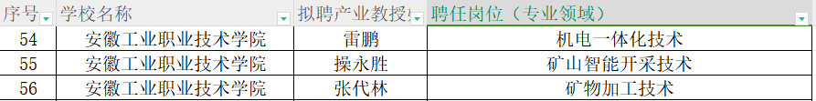 学院2003届优秀校友、英诺威阀业有限公司总经理、安徽省技术领军人才雷鹏为我院机电一体化岗位产业教授,铜陵有色金属集团冬瓜山铜矿采矿高级工程师操永胜为我院矿山智能开采技术岗位产业教授,铜陵有色金属集团铜冠(庐江)矿业公司选矿高级工程师张代林为我院矿物加工技术岗位产业教授。
