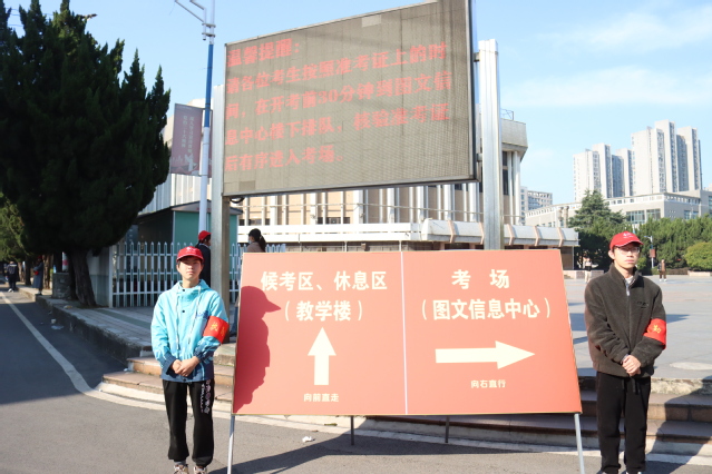 学院打造“全链条”考生服务体系,提前在校园内设立引导指示牌、电子大屏等,组织师生志愿者服务队,做好考生引领工作和家长接待工作,现场解答考生问题咨询,安保人员全天执勤,做好校内外交通引导疏散工作,确保考场周边秩序。