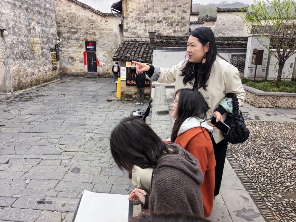 西递古村落以其保存完好的明清民居建筑群和独特的徽州文化闻名。写生期间,学生们在教师的指导下,通过速写的形式,记录古建筑的精巧结构、山水田园的自然风貌以及当地的人文风情。带队教师结合现场景物,讲解了构图、光影运用等专业技巧,将课堂理论转化为实践创作,帮助学生深化对艺术表现力的理解。在晚间评图会上,师生共同点评作品,不同专业视角的碰撞为创作提供了新思路。学生纷纷表示,实地写生不仅锻炼了观察力,更深刻体会到传统文化的独特魅力。