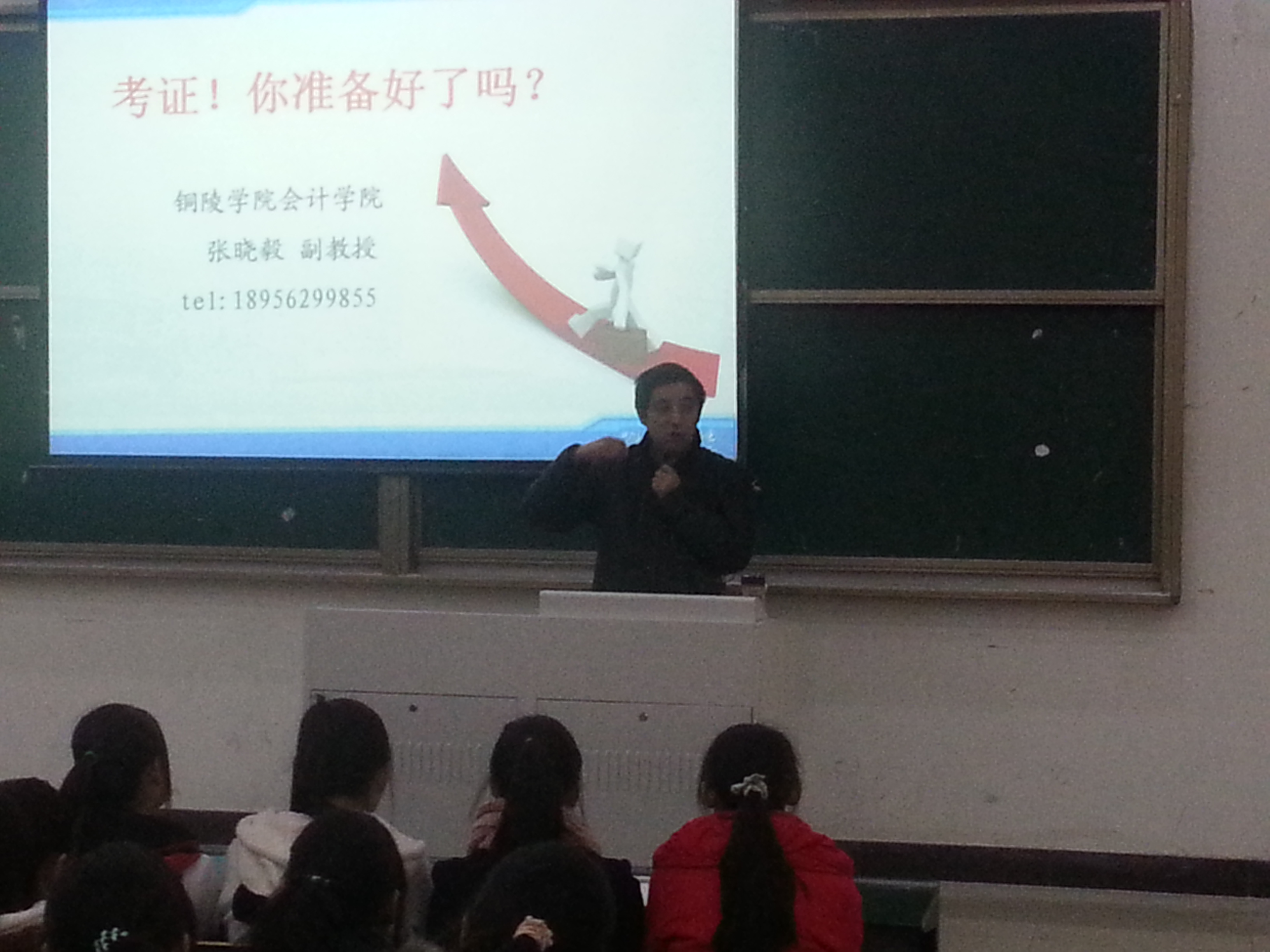 为了加强我系会计专业学生的考证教育,十二月六日下午我系特邀请铜陵学院张晓毅副教授在阶梯102教室举办了一次关于会计考证知识的讲座,讲座面向13级会计专业全体师生。 张教授以风趣幽默、深入浅出的演讲风格解读了会计专业的各种等级考试的相关政策,生动细致地介绍了他们多年来复习迎考的工作经验及备考注意事项,为我系会计专业学生的考证工作提供了政策依据和理论支撑。