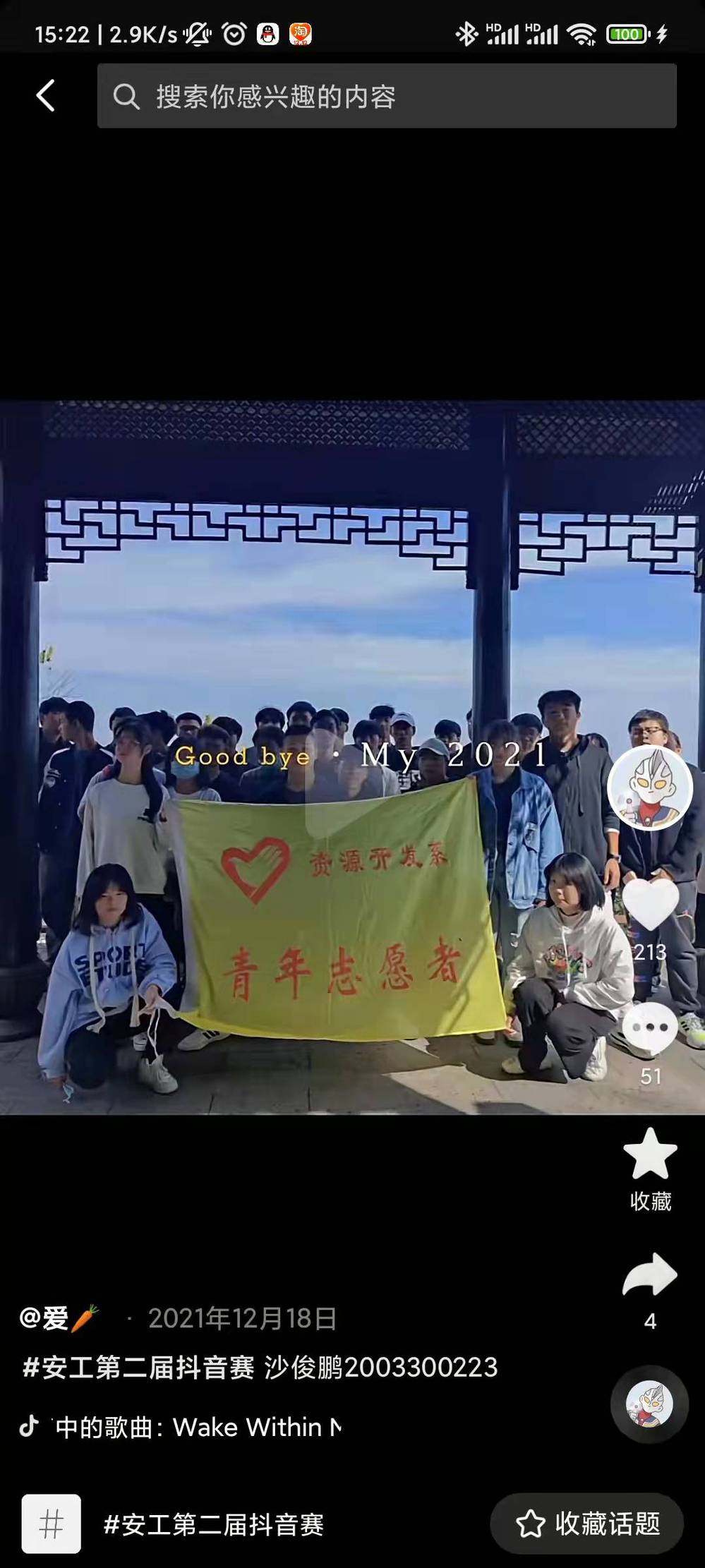 活动一发起,迅速吸引了全校同学积极参加,本次抖音大赛共有近500名同学参加,“安工第二届抖音赛”话题达到86.6万次播放。各参赛作品都是原创,经过同学们后期精心裁剪制作而成。每个作品都是同学们爱国爱校爱生活的剪影,也是同学们践行社会主义核心价值观的文化干货。本次比赛由管理系夏鹏宇、吴涛老师作为评委,按照评分细则确定获奖同学,具体获奖名单如下。