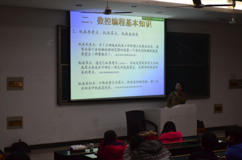2013年12月16日晚上七点我系开展了以加工中心的应用及未来发展方向为主题的讲座,外聘专家马老师主持本次讲座,12数控和13数控共四个班级参加本次讲座。马老师对数控编程有精辟的解析,独到的见解和大量的旁征博引。本次讲座,加深了12数控班学生对数控编程的认知和了解,使13数控班认识和了解数控编程的基本知识,便于以后学习数控编程这门课程。