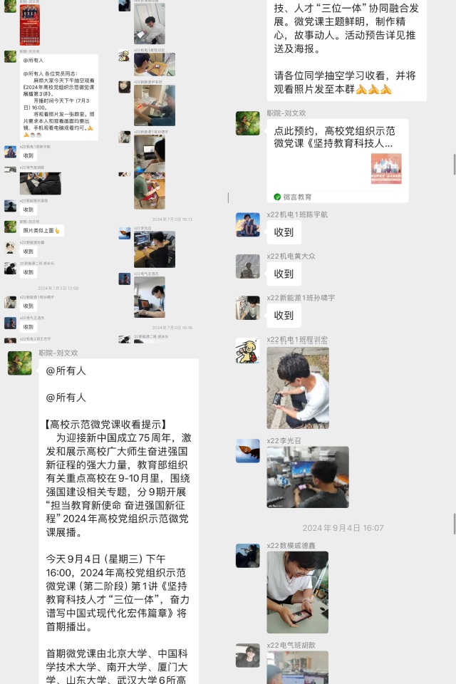 为迎接新中国成立75 周年,激励 22 级学生预备党员奋进强国新征程,9 月 4 日下午,机电工程学院组织线上学习“担当教育新使命 奋进强国新征程”2024 年高校党组织示范微党课展播活动。