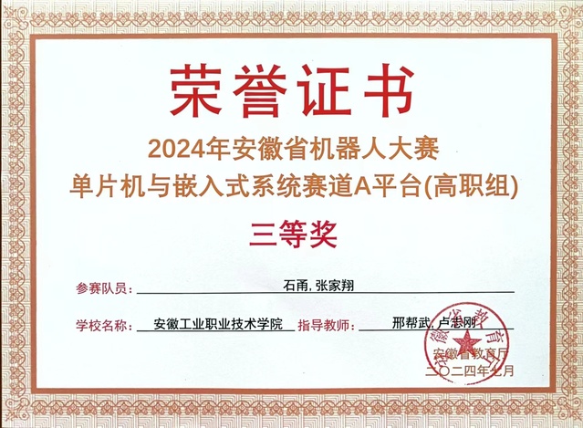 近日,备受瞩目的2024年安徽省机器人大赛圆满降下帷幕。在这场汇聚了全省顶尖科技智慧的盛会上,机电工程学院在单片机与嵌入式系统赛道A平台(高职组)中脱颖而出,再次书写辉煌篇章,一举夺得二等奖1项及三等奖3项的卓越佳绩。