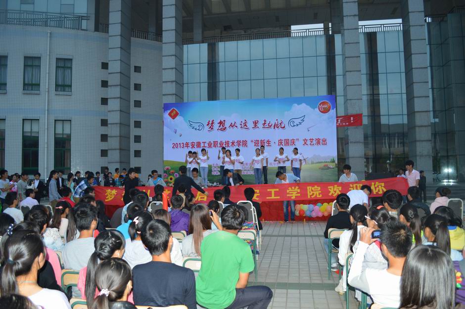 为热烈庆祝建国64周年,欢迎2013级新生的到来,展现学院深厚的校园文化积淀和浓郁的艺术氛围,9月27日下午,由学院团委、院学生会联合主办,中国移动铜陵分公司协办的“梦想从这里起航”2013年迎新生·庆国庆文艺演出在教学楼广场隆重举行。学院副院长丁忠兰、学生工作处、各系党支部书记、团总支书记等相关部门负责人亲临演出现场,与2013级新生欢聚一堂,共同观看了文艺演出。