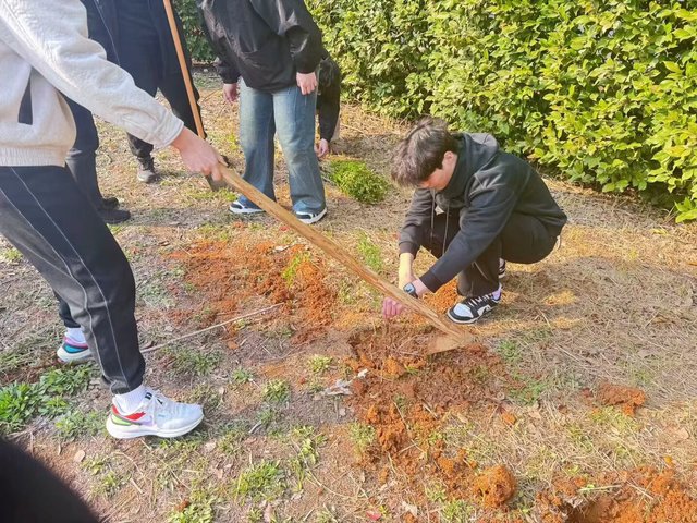 活动伊始,技术组用石灰粉精准标记出2米间距的树坑点位。挖坑过程中,坚硬土质与碎石块给同学们带来挑战,后勤组及时调配镐头工具,师生轮番上阵破开硬土。现场一位散步的老园丁主动指导:“带着土球的麻布袋直接栽种,既保墒又能自然降解”,让同学们收获了实用植树技巧。