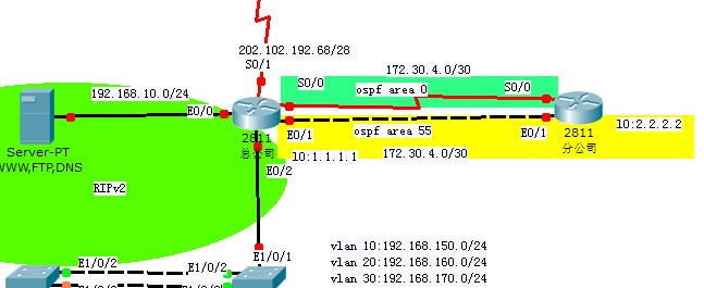 l 请根据下面示意图配置RIP路由和OSPF路由(OSPF process号码任意),其中zongbu的OSPF router-id为1.1.1.1,fenbu的OSPF router-id为2.2.2.2(5’)