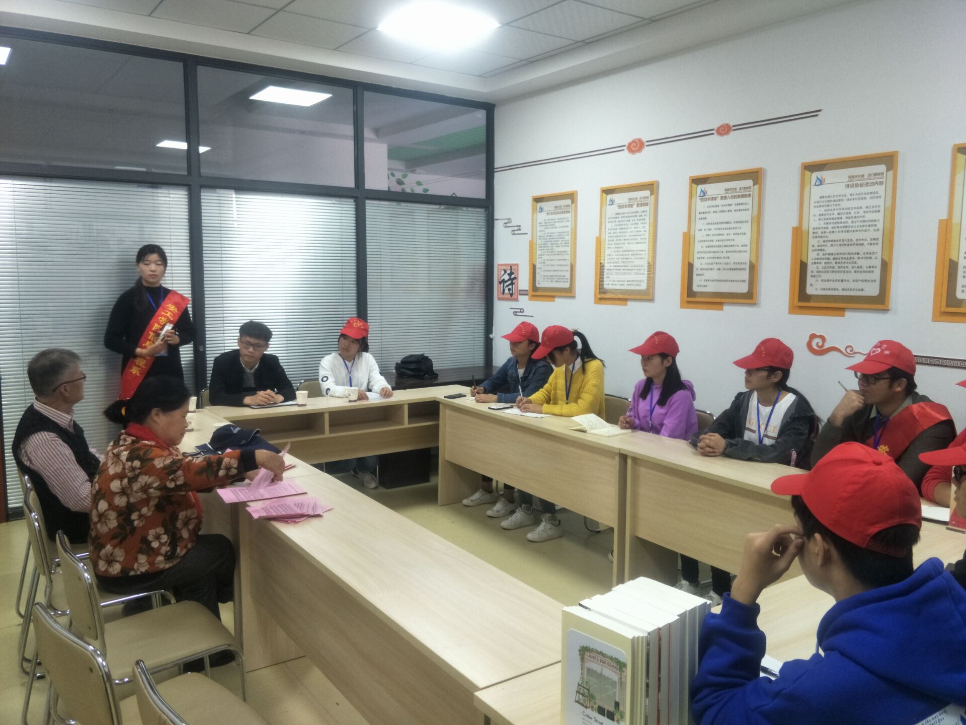 2018年10月19日下午2点半,同学们来到天井湖社区和等在这里的庒爷爷、刘奶奶和陈奶奶进行了愉快的座谈。座谈中爷爷奶奶们从衣、食、住、行和医疗等各个方面和同学们进行了交流。忆苦思甜,爷爷奶奶们感慨万千,同学们也听得非常入神。最后,爷爷奶奶叮嘱同学们:现在时代在进步,以后你们会走出去、会出国,可能走的更遥远。再艰难的日子我们也走过来了,不要忘记自己本家,始终要记得我们是中国人,无论到了那里,不要忘记,我们身上留的是中国人的血。
