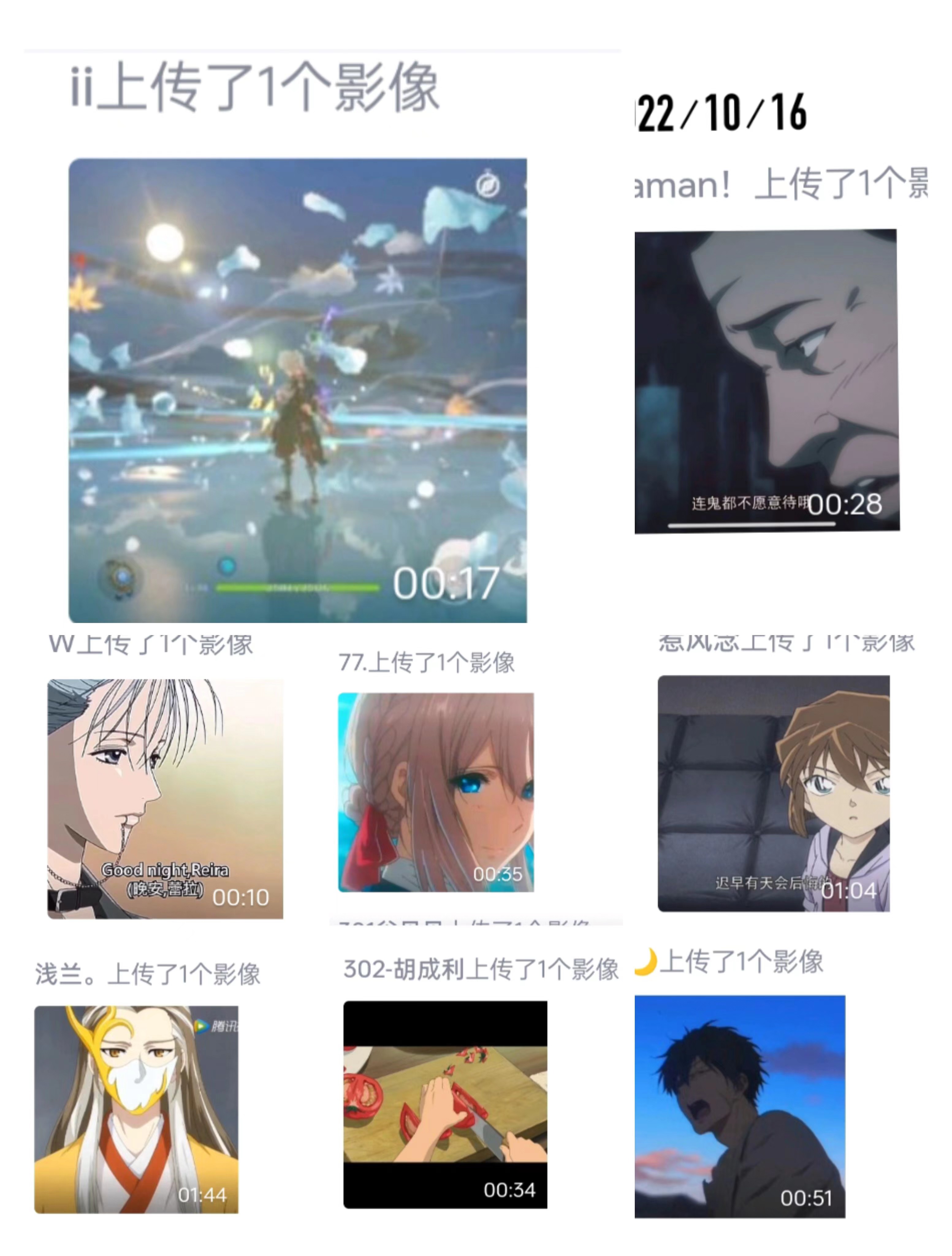 活动当晚,同学们将剪辑好的视频上传至群相册,他们运用了自己所学习的剪辑技术,将动漫中的美好片段剪出来,让我们看见了动漫所带来的美好,让我们身心抽离疲惫的日常,也能看出他们是如此的热爱着动漫。